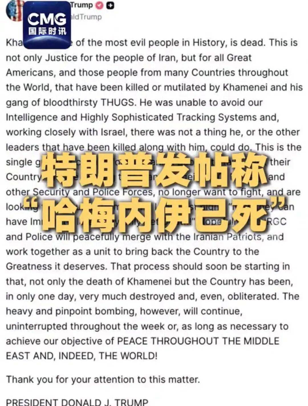 当地时间2月28日,美国总统特朗普在其社交媒体“真实社交”发文表示,伊朗最高领袖哈梅内伊已身亡。特朗普称,哈梅内伊“无法逃脱我们高度精密的情报和追踪系统”,再加上与以色列的密切合作,他和与他一同身亡的其他领导人都无计可施。